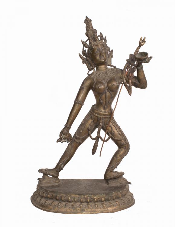 Dakas (male) and Dakinis (female) are a class of demon gods and goddesses, believed to be flying in the sky. Dakini literally means “sky walking women". They are used as synonym for prajna, the embodiment of wisdom. They are also used to designate the female partner in the tantric initiation, and thus she can be both human and superhuman.
