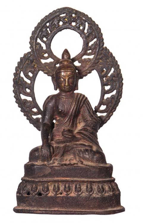 Shakyamuni is regarded as the second most important dhyani Buddha by the Nepalese Buddhists. Shakyamuni originates from the syllable Hum. He is the essence of purified form of hatred. The image of Shakyamuni or akshobhya Buddha is generally placed in the east in the stupa. He is blue in color. He is two armed single faced and exhibits the Bhu-sparsa (earth touching) mudra which indicates calling the earth for witness for all holy deeds done in all past lives, and sits in the vajraparyanka pose. His left hand is on the lap, while the right rest on the right knee with the tip of the middle finger touching the ground with palm drawn inwardly. His vehicle is a pair of white elephant and his symbol is the Vajra or the thunderbolt.
