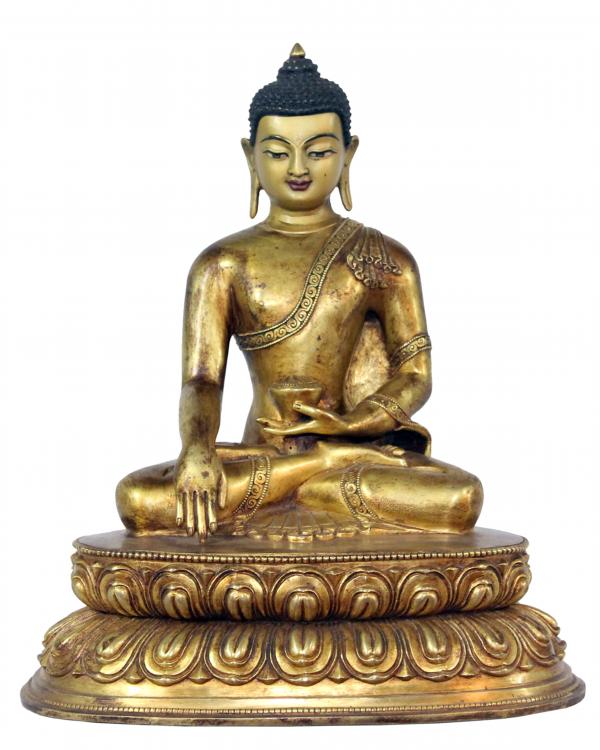 Shakyamuni is regarded as the second most important dhyani Buddha by the Nepalese Buddhists. Shakyamuni originates from the syllable Hum. He is two armed single faced and exhibits the Bhu-sparsa (earth touching) mudra which indicates calling the earth for witness for all holy deeds done in all past lives, and sits in the vajraparyanka pose. His left hand is on the lap,while the right rest on the right knee with the tip of the middle finger touching the ground with palm drawn inwardly. He represents the primordial cosmic element of Vijnana (consciousness). When represented in the Stupa, he always faces the east. His vehicle is a pair of white elephant and his symbol is the vajra or the thunderbolt. His female escort is Lochana.