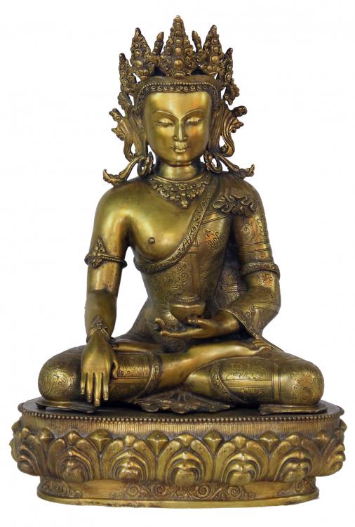 Shakyamuni is regarded as the second most important dhyani Buddha by the Nepalese Buddhists. Shakyamuni originates from the syllable Hum. He is two armed single faced and exhibits the Bhu-sparsa (earth touching) mudra which indicates calling the earth for witness for all holy deeds done in all past lives, and sits in the vajraparyanka pose. His left hand is on the lap,while the right rest on the right knee with the tip of the middle finger touching the ground with palm drawn inwardly. He represents the primordial cosmic element of Vijnana (consciousness). When represented in the Stupa, he always faces the east. His vehicle is a pair of white elephant and his symbol is the vajra or the thunderbolt. His female escort is Lochana.