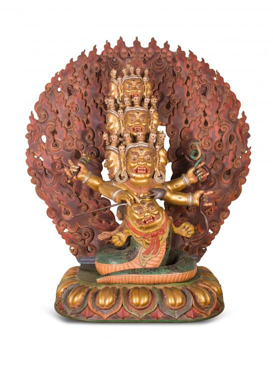 Rahula is the horrific Nyingma protector deity, wrathful, with nine heads and a giant face on the belly. It is likely that the depiction of this Buddhist protector is a Tibetan creation. In the ancient tradition of Tibetan Buddhism (Nyingma) Rahula became popular as a protector of the ‘revealed treasure’ teaching (terma). In Buddhist depictions, he is portrayed with the lower body of a coiled serpent spirint (naga) and the upper body with four arms, nine head, adorned with a thousand eyes. In the middle of the stomach is one large wrathful face. The face in the stomach, belly is actually the face and head of Rahula. The nine stacked heads depicted above are the nine planets that Rahula has eclipsed, or rather literally swallowed, eaten and now symbolically appear on top of his own face and insatiable mouth. At the crown of the stack of all the heads is the head of a black raven.