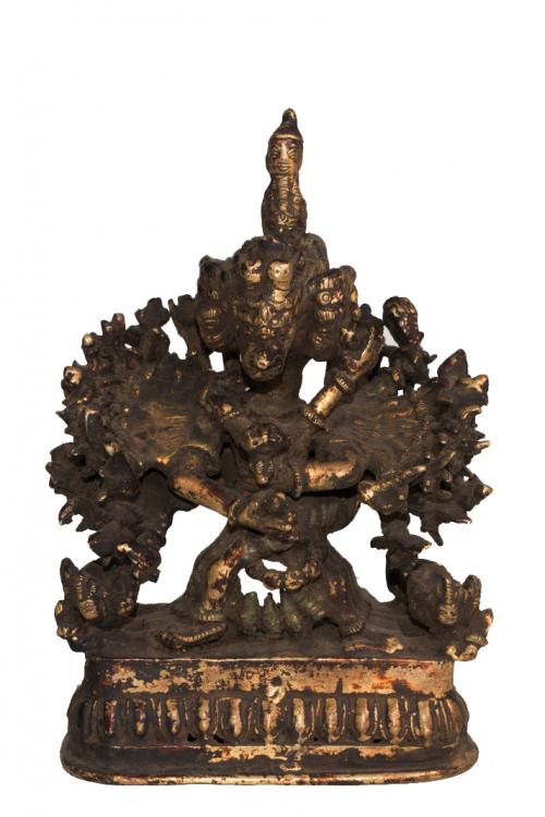 Description Yamantaka is a wrathful expression of manjyushree, the Samyaksambuddha of wisdom who, in other contexts, also functions as a dharmapala or a Heruka. Yamantaka manifests in several different forms, one of which (via yogatantra) has six legs, six faces and six arms holding various weapons while sitting or standing on a water buffalo. Within Buddhism, "terminating death" is a quality of all buddhas as they have stopped the cycle of rebirth, samsara. Yamantaka, then, represents the goal of the Mahayana practitioner's journey to enlightenment, or the journey itself: in awakening, one adopts the practice of Yamantaka – the practice of terminating death. Product Details Code No.: Size: 18 cm Material: Copper |