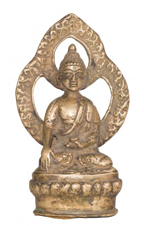Shakyamuni is regarded as the second most important dhyani Buddha by the Nepalese Buddhists. Shakyamuni originates from the syllable Hum. He is the essence of purified form of hatred. The image of Shakyamuni or akshobhya Buddha is generally placed in the east in the stupa. He is blue in color. He is two armed single faced and exhibits the Bhu-sparsa (earth touching) mudra which indicates calling the earth for witness for all holy deeds done in all past lives, and sits in the vajraparyanka pose. His left hand is on the lap, while the right rest on the right knee with the tip of the middle finger touching the ground with palm drawn inwardly. His vehicle is a pair of white elephant and his symbol is the Vajra or the thunderbolt.