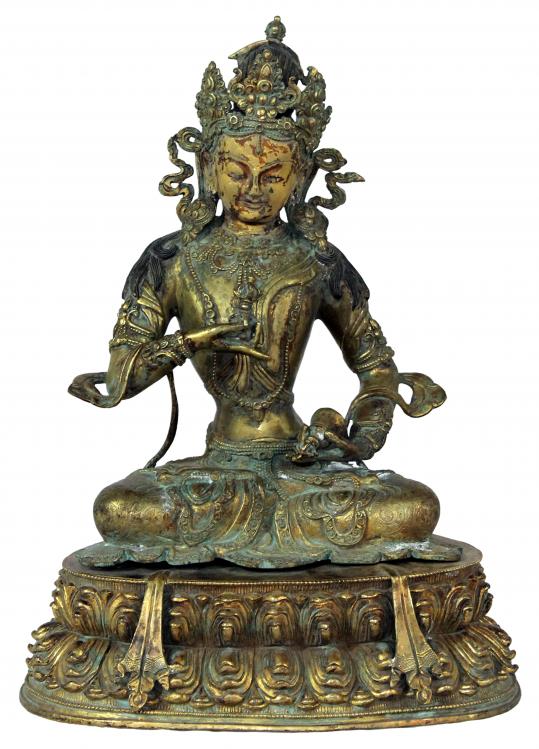 Vajrasattwa the sixth Dhyani Buddha, is regarded by the Nepali Buddhist as the priest of the five Dhyani Buddha. He is not represented in the stupa like other Dhyani Buddhas but independent shrines are dedicated to his worship. His worship is always performed in secret and is not open to everybody. Vajrasattwa is represented in two forms, single and yabyum. White in color, sitting cross legged in the meditative pose like other Dhyani Buddhas, he wears all ornaments, rich dress and a crown. He carries the vajra (dorje) in his right hand with palm upwards against the chest and ghanta (bell) in the left hand resting upon the left thigh.