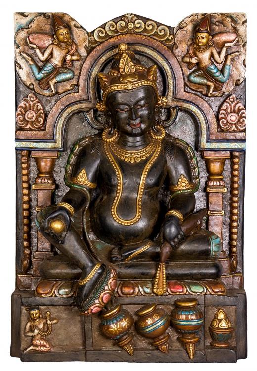 The lord jambhala, with a body black in colour, having the appearance of a dwarf, pot-bellied, without pierced ears, brown hair flowing upwards and bared fangs, adorned with the eight great nagas. The right hand holds a blood filled skullcup and the left a mongoose expelling various jewels. The right leg is extended pressing upon the yellow lord of wealth, adorned with various gold ornaments, lying supine expelling various jewels from the mouth.